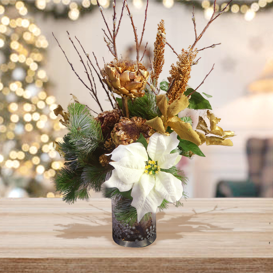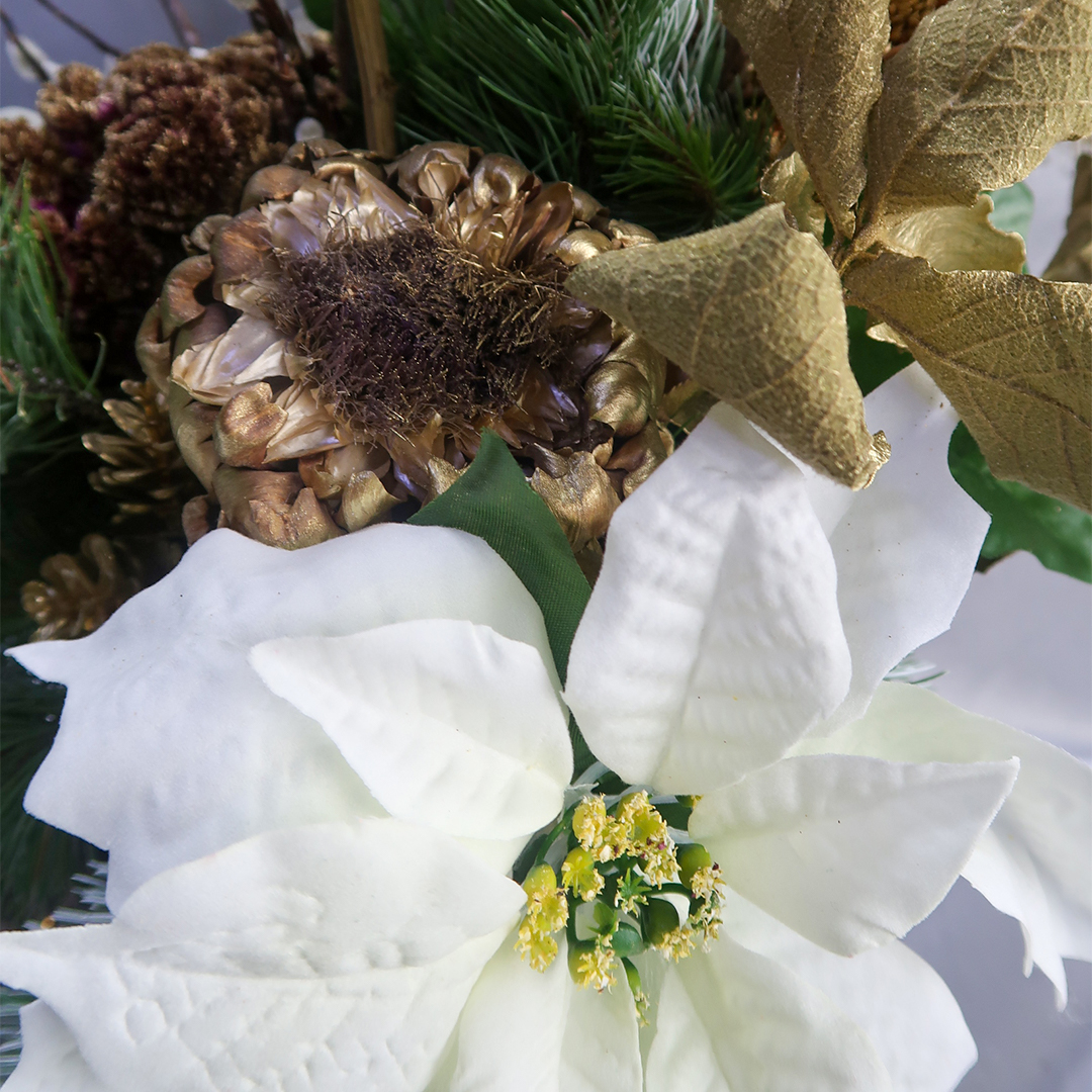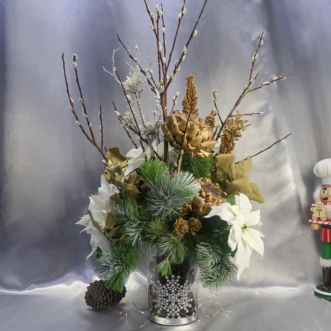 Este hermoso arreglo esta compuesto por nochebuenas blancas artificiales, flor de alcachofa, oyamel, sorgo y uña de gato, en una base de cristal adornada con piña natural