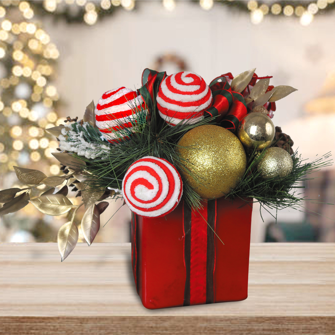 Hermoso arreglo en base de cerámica en forma de regalo, que incluye: un mix de esferas, hojas de pino natural y artificial, piñas y hojas doradas artificiales.