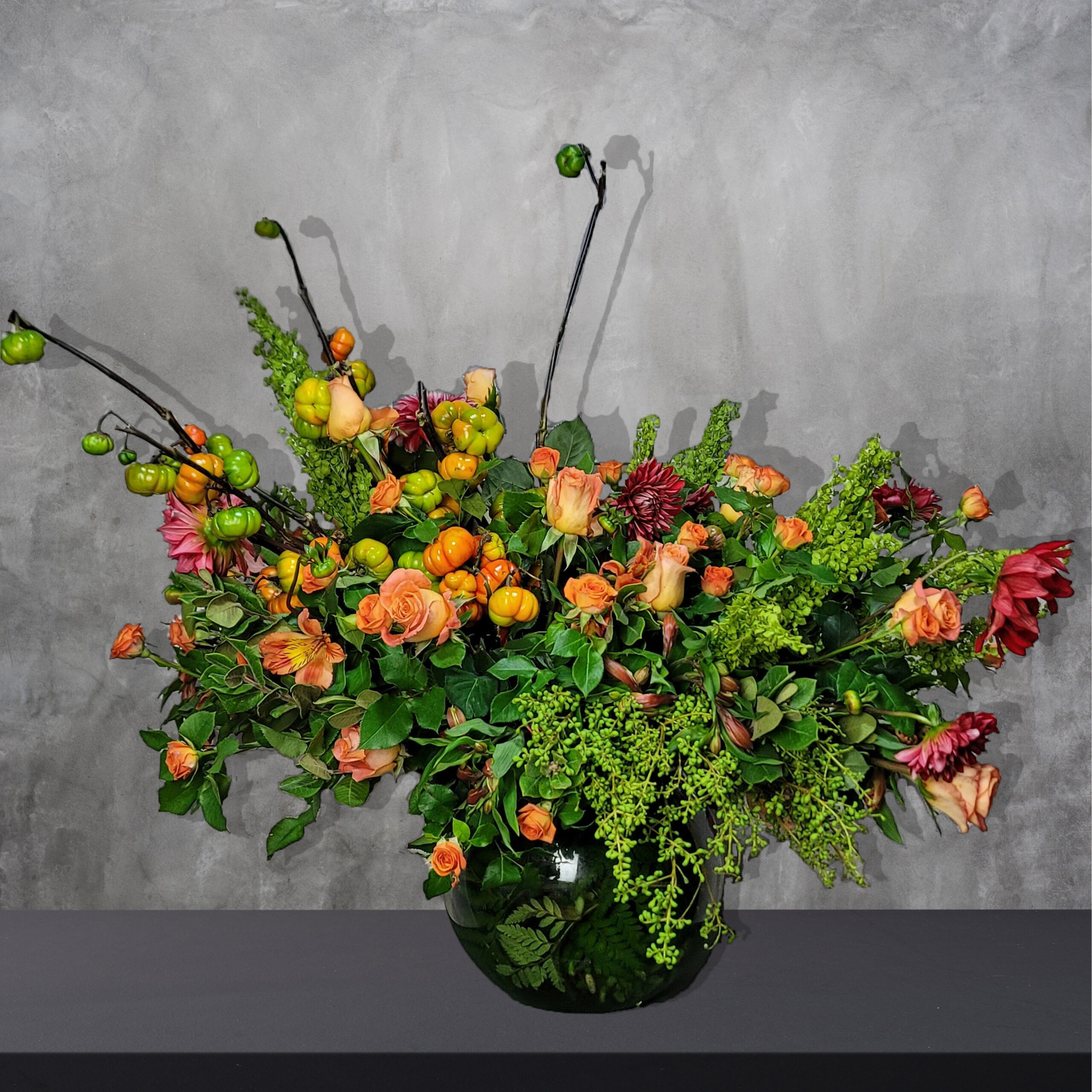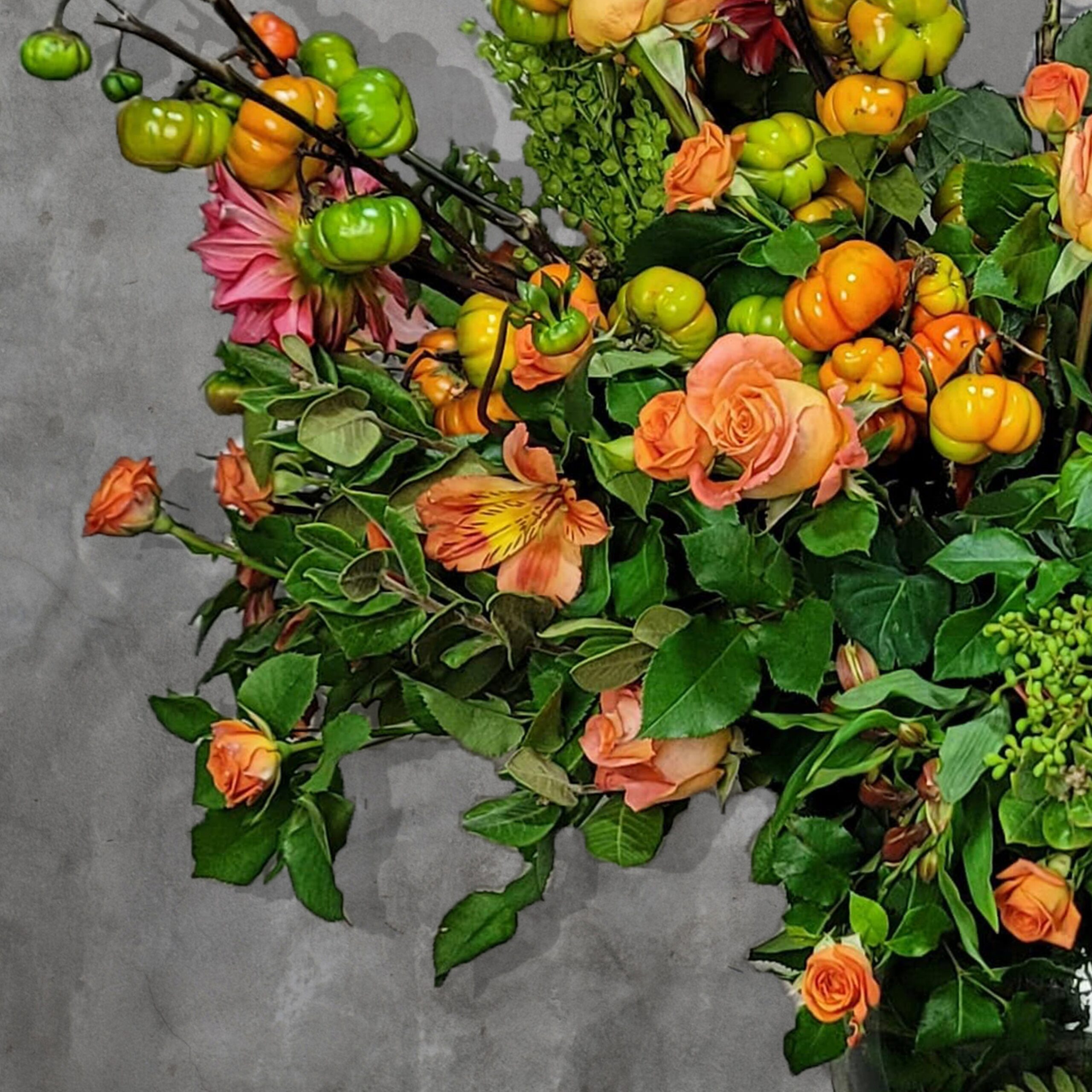 Un tributo a la abundancia y calidez de la estación. Cosecha Otoñal reúne la riqueza cromática del otoño en un diseño lleno de vida: mini calabaza, mini rosa naranja y dalia roja se entrelazan con follajes verdes vibrantes y otros acentos naturales que evocan la magia de la cosecha.