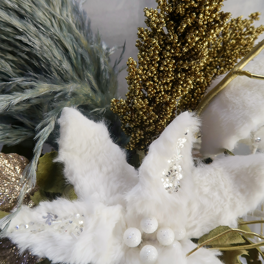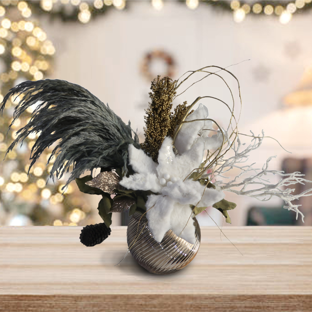 Arreglo en base de cristal dorada en forma de esfera compuesta por nochebuena artificial, encino, pampagras, sorgo y curly.