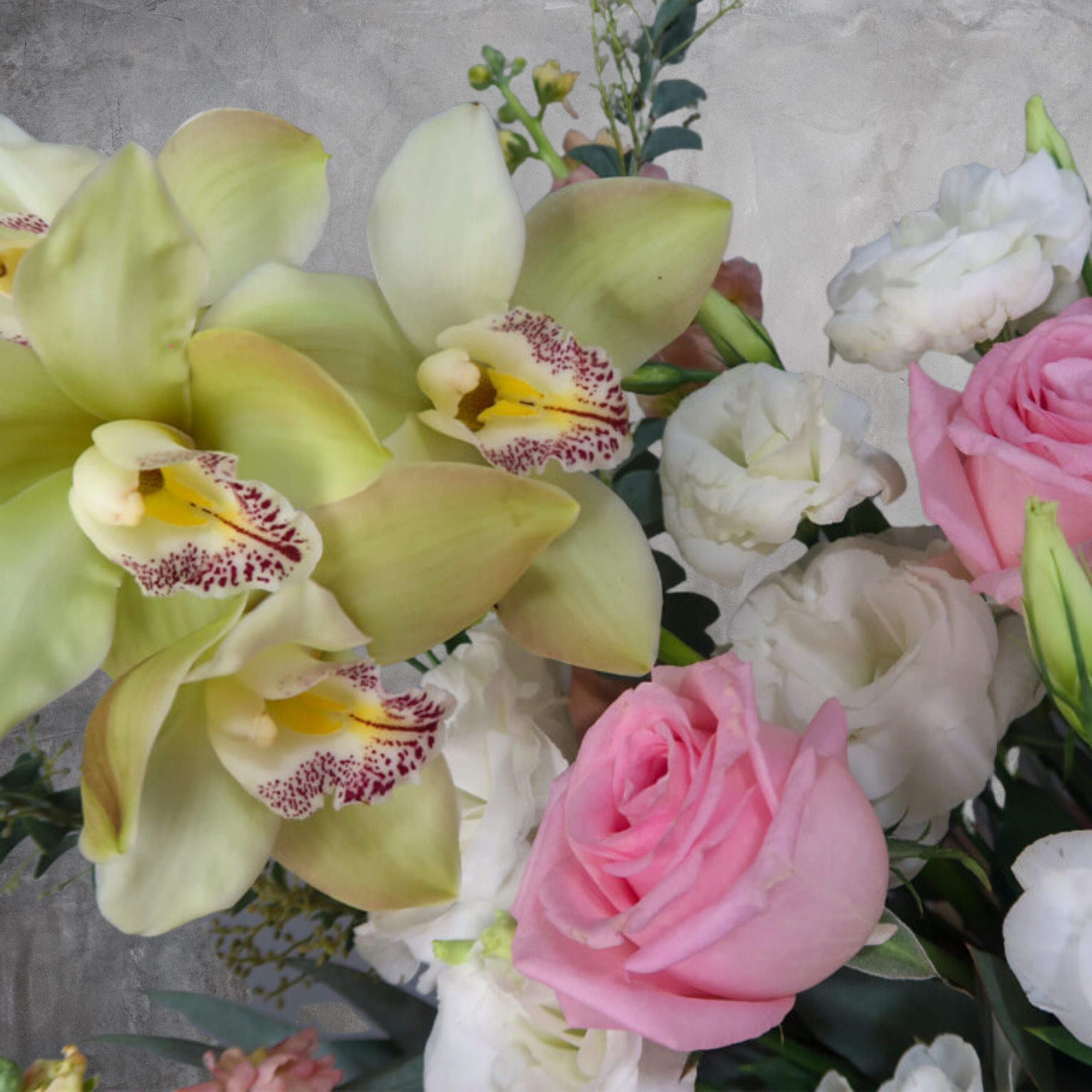 Una selección de hermosas flores de la más alta calidad es todo lo que este arreglo tiene, podrás encontrar en el rosa caricia, lisianthus rosa y blanco, espuela orquídea cymbidium y eucalipto.