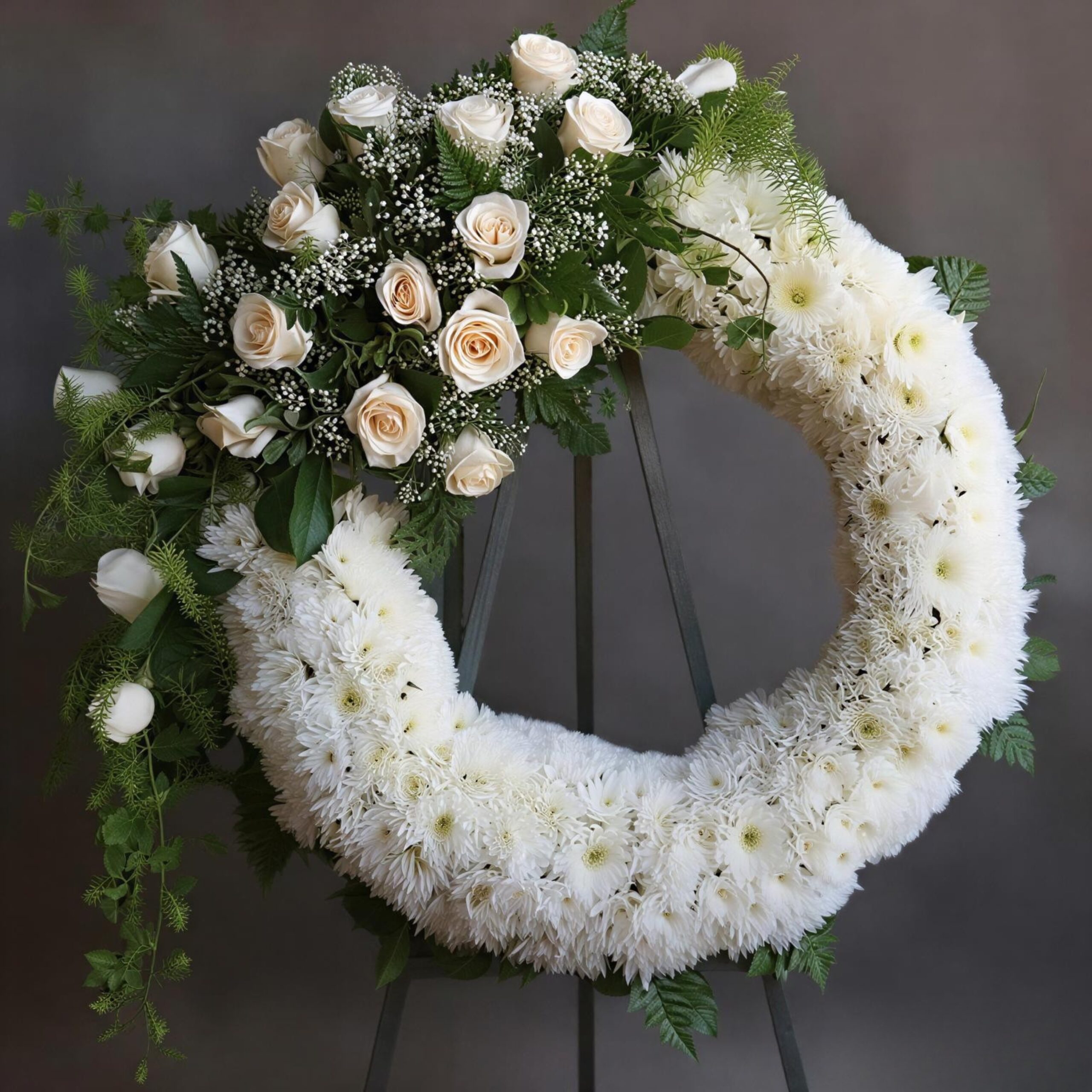 La corona Fortaleza de Las Rosas de Aurelia es un tributo elegante y solemne que transmite serenidad y respeto eterno. Elaborada con un delicado aro de crisantemos blancos, símbolo de pureza y paz, realzada con rosas marfil finamente dispuestas, esta pieza floral refleja consuelo, esperanza y fortaleza en los momentos de despedida.