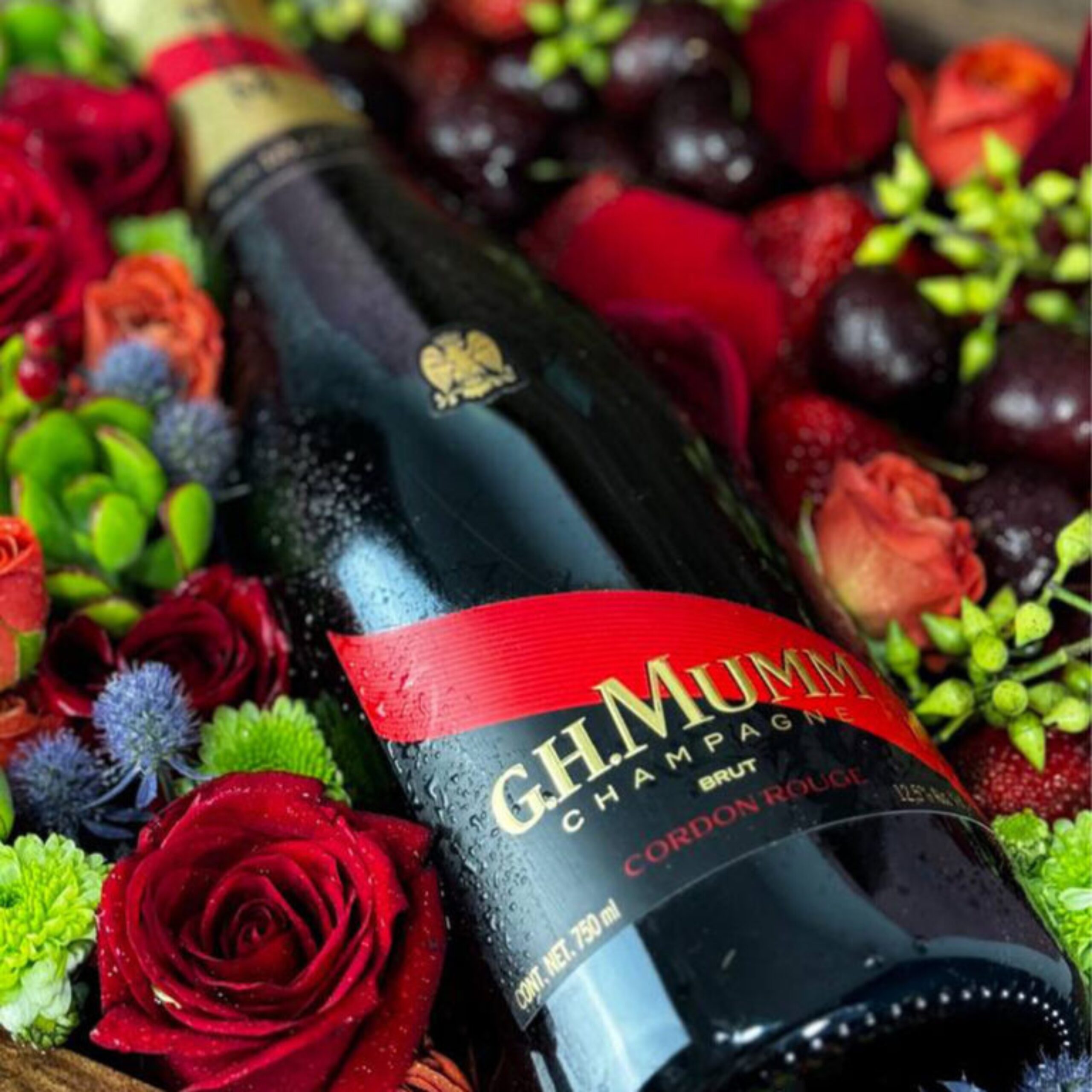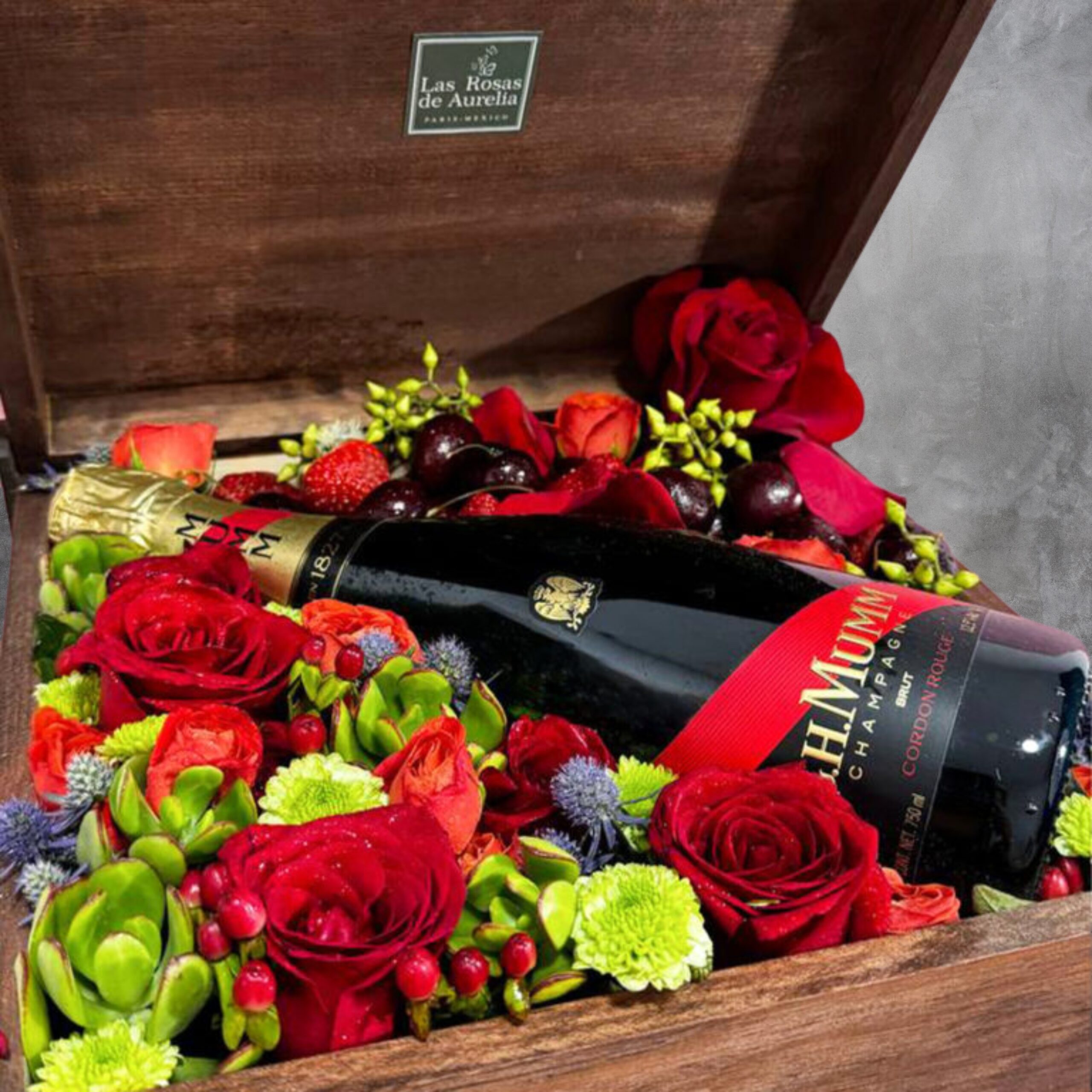 Llega a esa cena romántica con este hermoso arreglo que incluye una botella de Champagne G.H. Mumm, fresas, cerezas, rosa roja y mini rosa naranja.