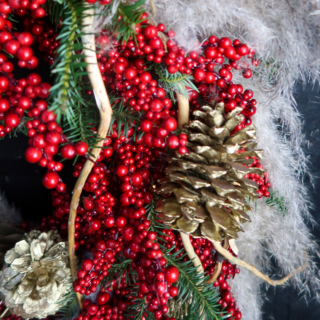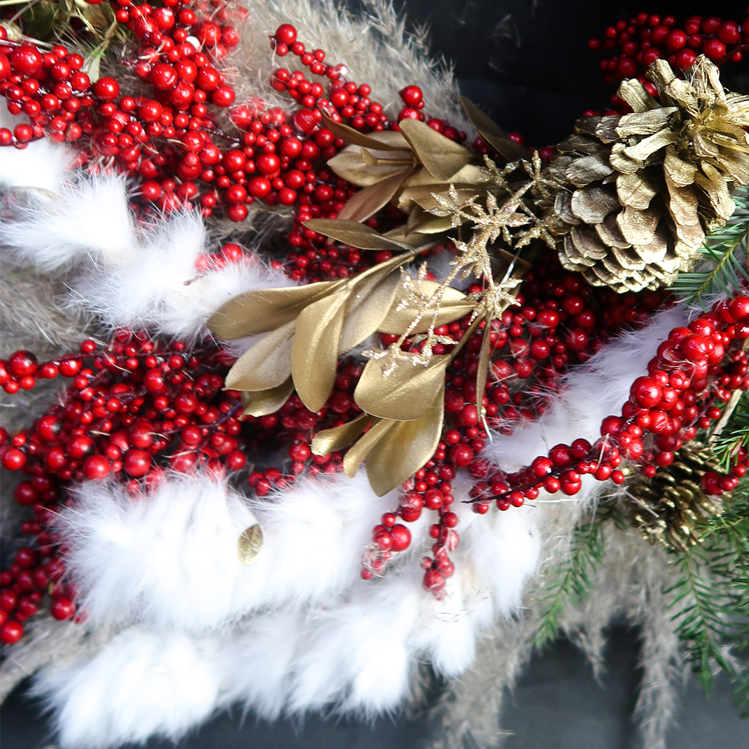 Corona artificial de muérdago rojo, adornada con encino verde, oyamel, pampagras, membrillo  y piñas.