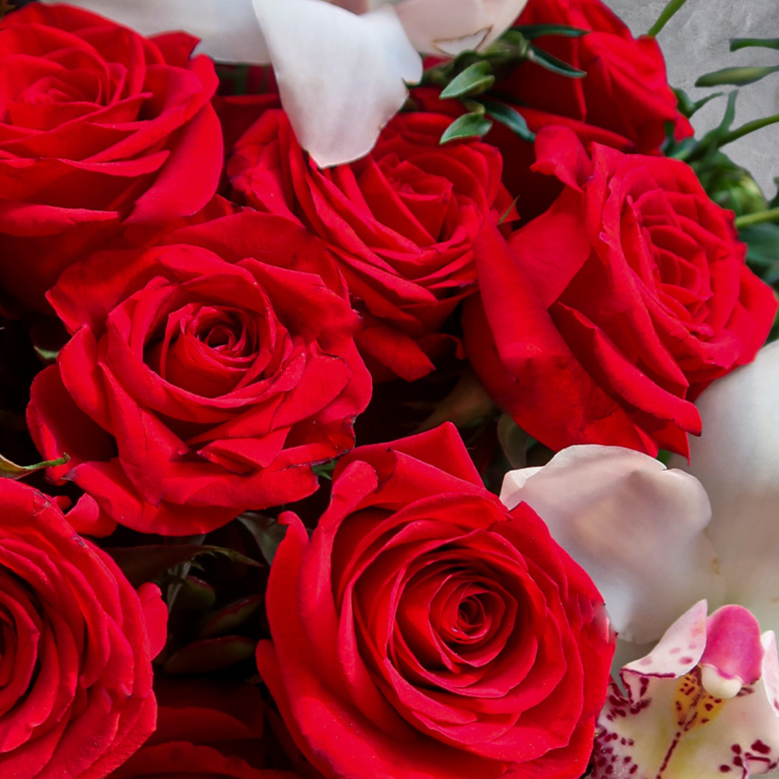 Este arreglo perfecto para expresar amor con locura, esta compuesto por rosa roja, orquídea cymbidium, renancula mariposa, dracena y adornado con hoja de ave negra que le da el toque de elegancia y pasión.
