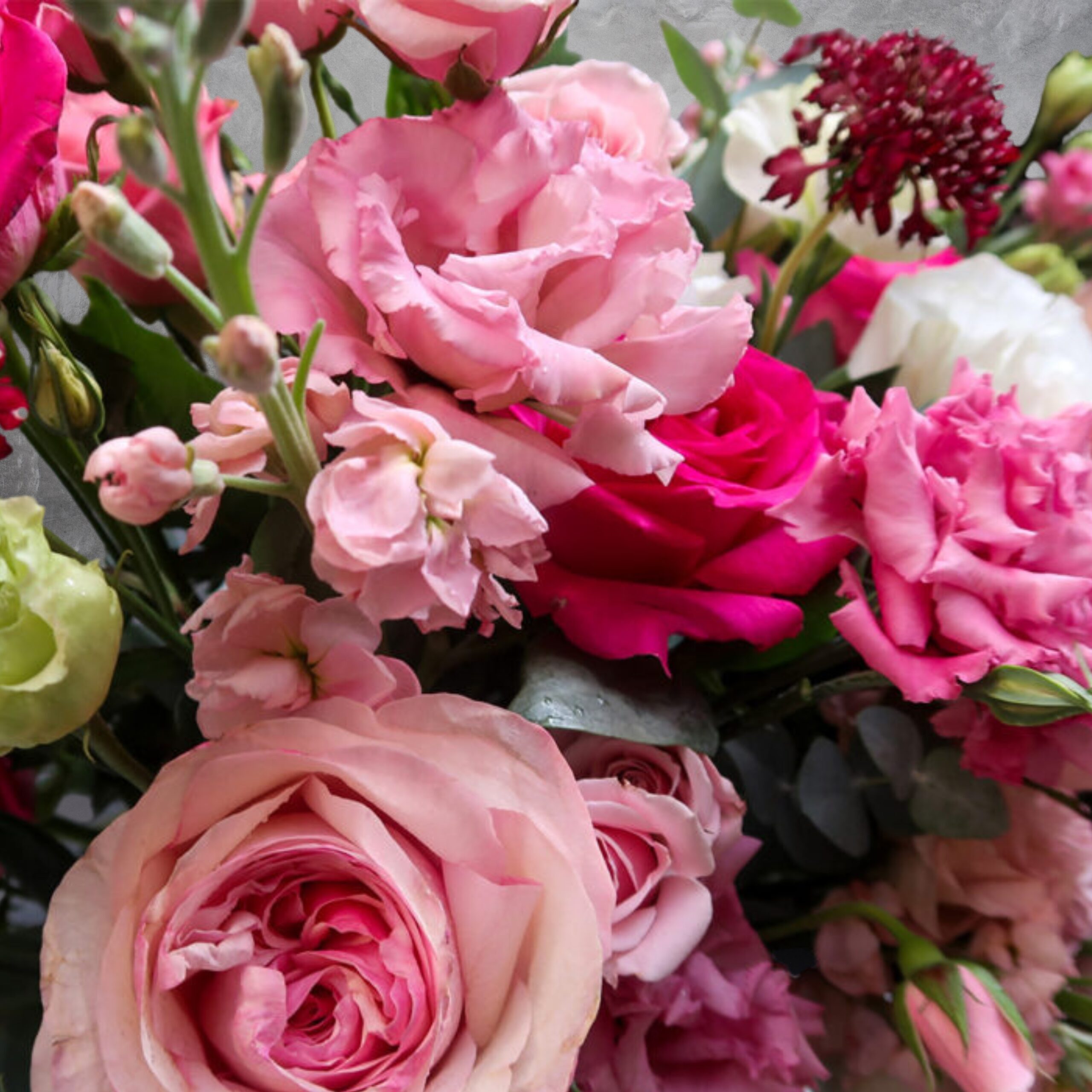 Compuesto por una variedad de flores que sin duda encantaran a esa persona especial, podrás encontrar en el tulipan, rosa fucsia, mini rosa, lisianthus, rosa inglesa, matiola, escabiosa y eucalipto.